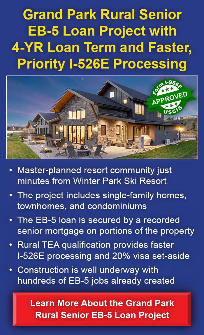 Project Developer Grand Park Development LLC EB-5 Offering $80,000,000 Min. Investment $800,000 Structure Secured Loan Term 4 Years Escrow Yes I-956F Exemplar USCIS Approved I-526E Filings Now Available Project Security View Details The Grand Park EB-5 project includes for-sale homes, rental apartments, commercial space, lodging, and recreation across 1,665 acres in Fraser, Colorado, adjacent to Winter Park Ski Resort. Over 260 homes have sold totaling $190M+. Construction is underway, and more than 150 new EB-5 jobs have already been created. The developer group contributed land and improvements valued at ~$184M. The project is in a rural TEA and qualifies for faster I-526E processing and a 20% visa set-aside.