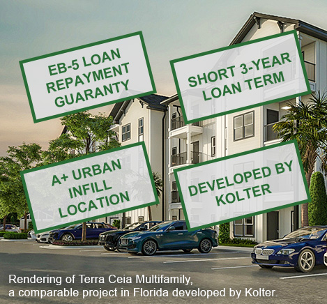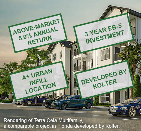Project Developer The Kolter Group EB-5 Offering $25,600,000 Min. Investment $800,000 Structure Secured Loan Term 3 Years Escrow Yes I-956F Exemplar USCIS Approved I-526E Filings Now Available Project Security View Details Change the first and second sentence to Brandon Multifamily is a 280-unit multifamily rental apartment community located in Brandon, Florida. Brandon Multifamily follows a nearly identical structure to EB5AN’s successful Boynton Beach Multifamily and Terra Ceia Multifamily projects, which are also developed by Kolter. The multifamily apartment is expected to be managed by industry leader Greystar. The project qualifies as an urban TEA, which means access to set-aside visas (available for all countries, which means no visa backlog) and concurrent filing for EAD.