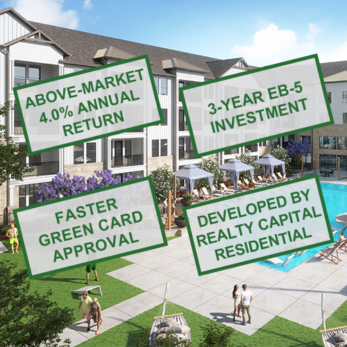 Project Developer Realty Capital Residential EB-5 Offering $18,400,000 Min. Investment $800,000 Structure Equity with Preferred Return Annual Return 4% Target Term 3 Years Escrow Yes I-956F Exemplar Pending I-526E Filings Now Available Project Security View Details The Lakeview Landing multifamily development is a 289-unit multifamily community located in Granbury, Texas. This project follows a nearly identical structure to EB5AN’s Boynton Beach Multifamily, Terra Ceia Multifamily, and Brandon Multifamily projects, all of which are USCIS Form I-956F approved. The project is in a rural TEA location and qualifies for faster I-526E petition processing and access to 20% EB-5 visa set aside (available for all countries, which means no visa backlog) and concurrent filing for EAD.