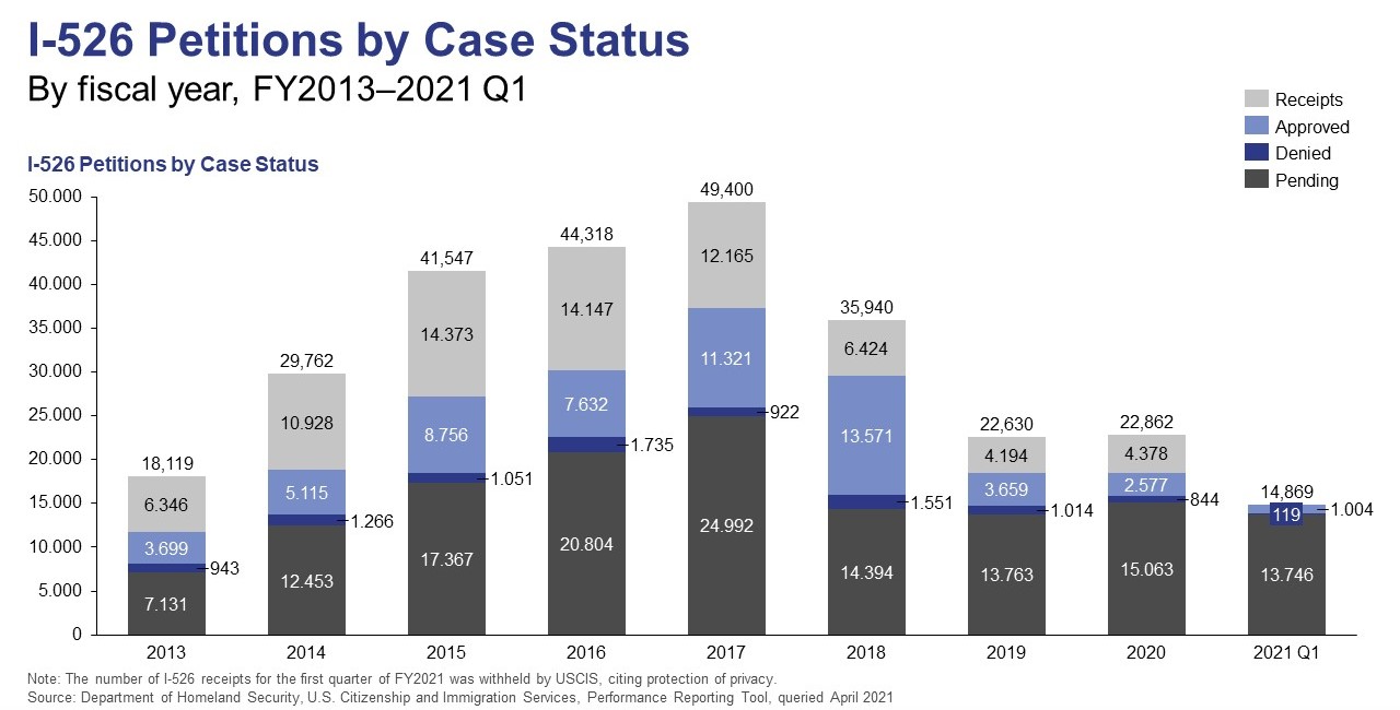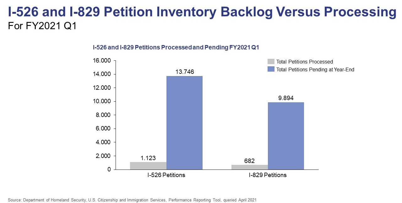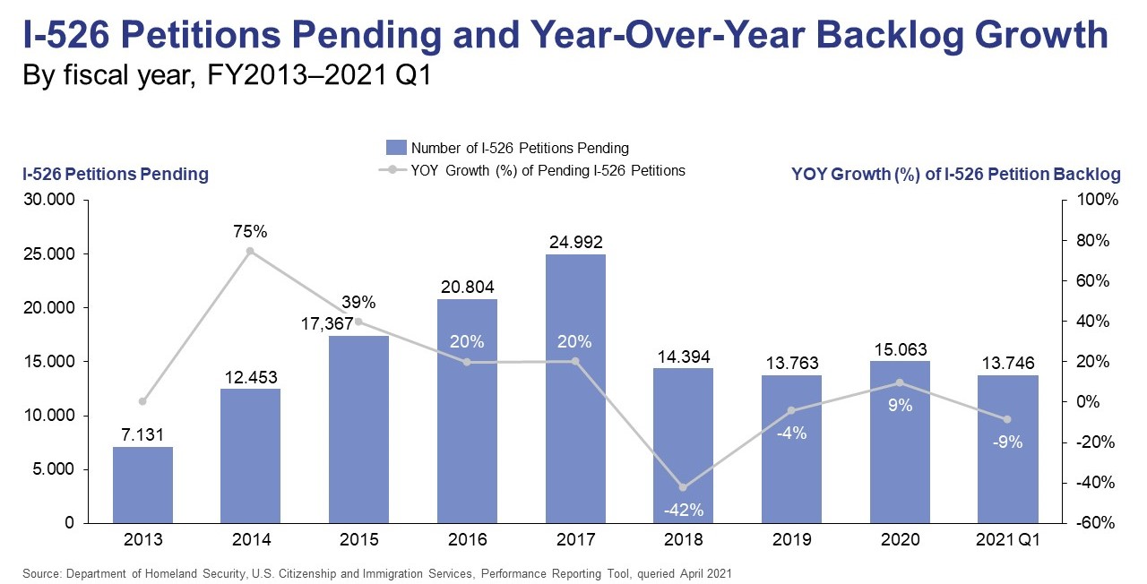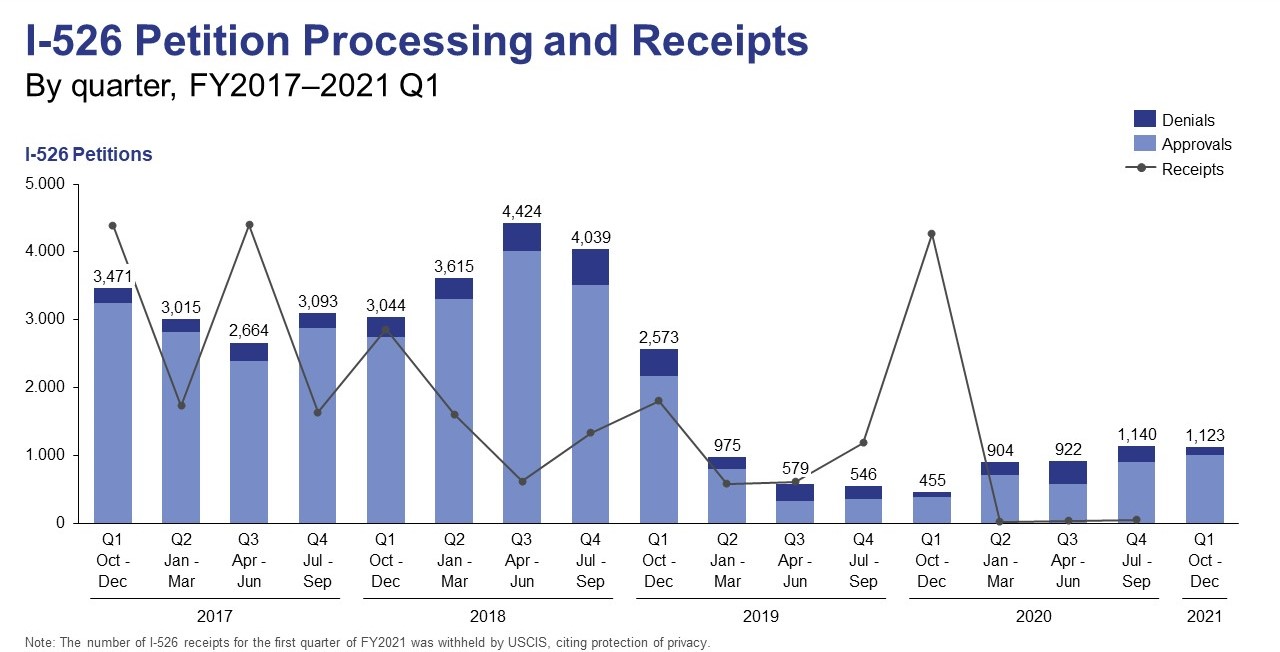 The good news, however, is that quarterly approvals are up from FY2020 Q4, and if the trend continues, FY2021 will record higher numbers overall than FY2020. The I-526 petition backlog also decreased by 9% in FY2021 Q1, as opposed to the 9% increase recorded in FY2020. Though this may be due more to a lack of incoming I-526 petitions rather than adjudication productivity, the figures are still good news.