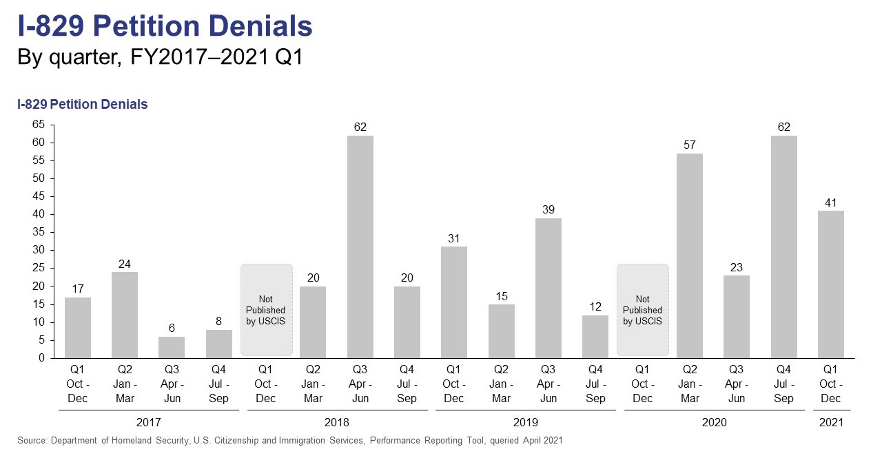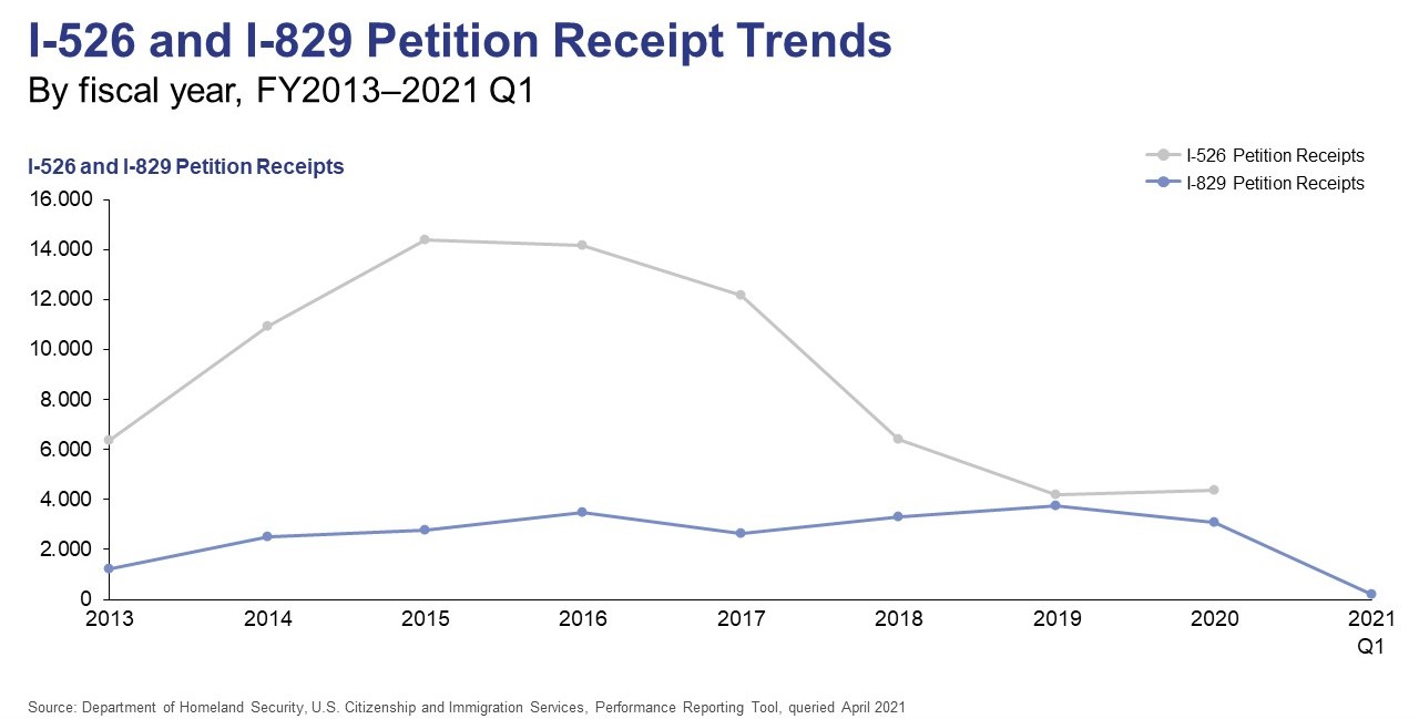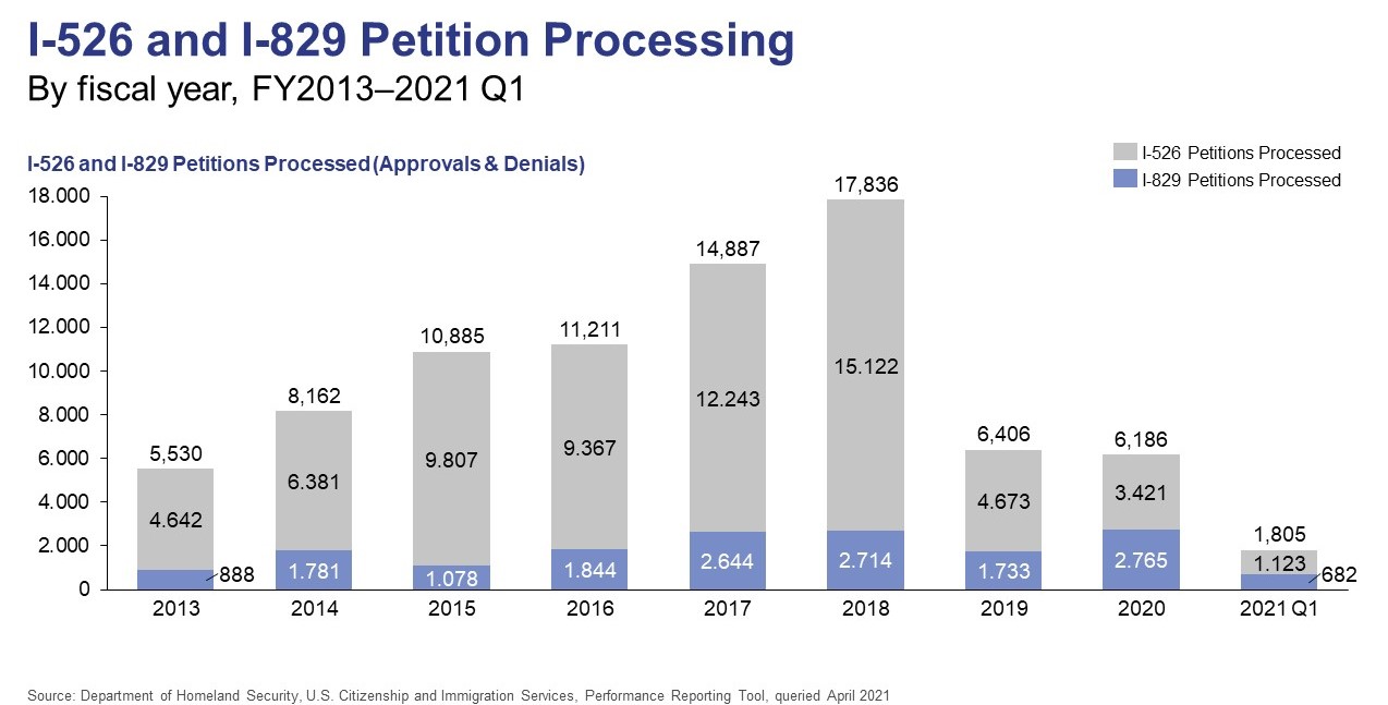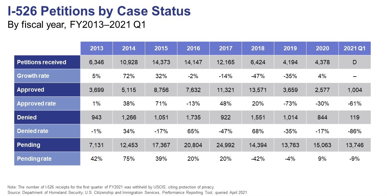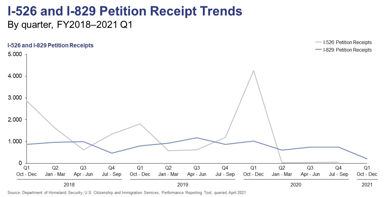 The good news, however, is that quarterly approvals are up from FY2020 Q4, and if the trend continues, FY2021 will record higher numbers overall than FY2020. The I-526 petition backlog also decreased by 9% in FY2021 Q1, as opposed to the 9% increase recorded in FY2020. Though this may be due more to a lack of incoming I-526 petitions rather than adjudication productivity, the figures are still good news.
