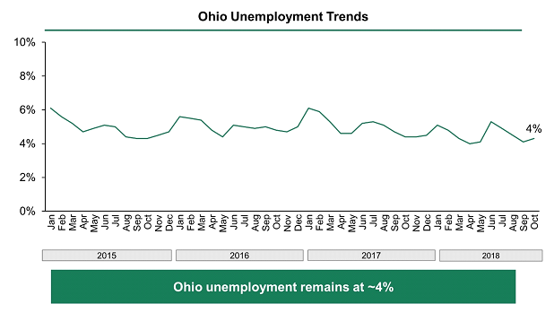 Unemployment statistics for 2018 show average unemployment in Ohio at around 5.0%.