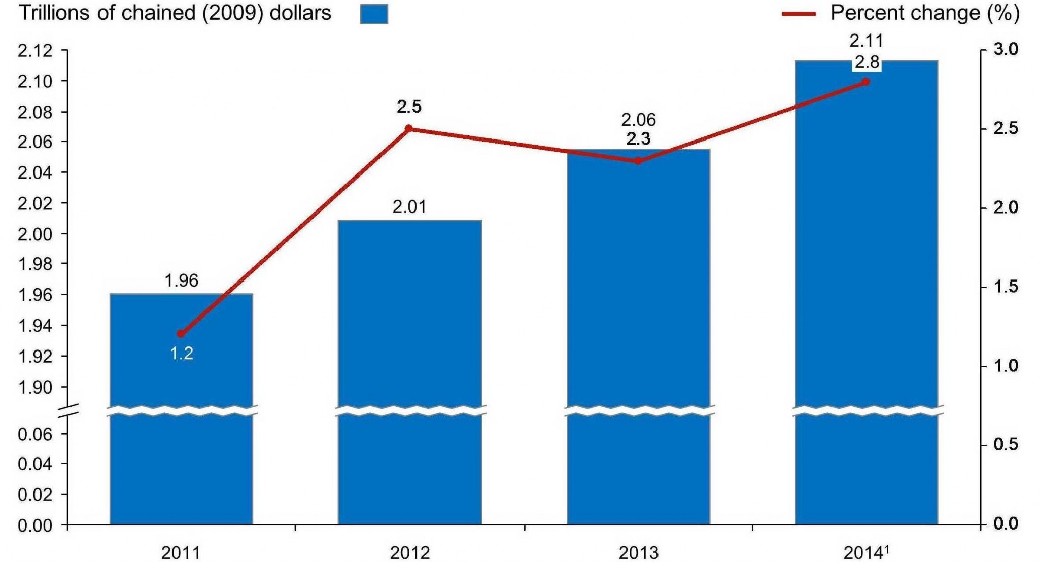From 2011 to 2014, California’s GDP grew by 7.65%, with an average annual GDP growth of 2.2%. In 2014, California’s real GDP was $2.11 trillion, the highest of any state in the U.S. 2013 to 2014 saw the largest percent change in GDP at 2.8%, signaling a strong and growing economy.