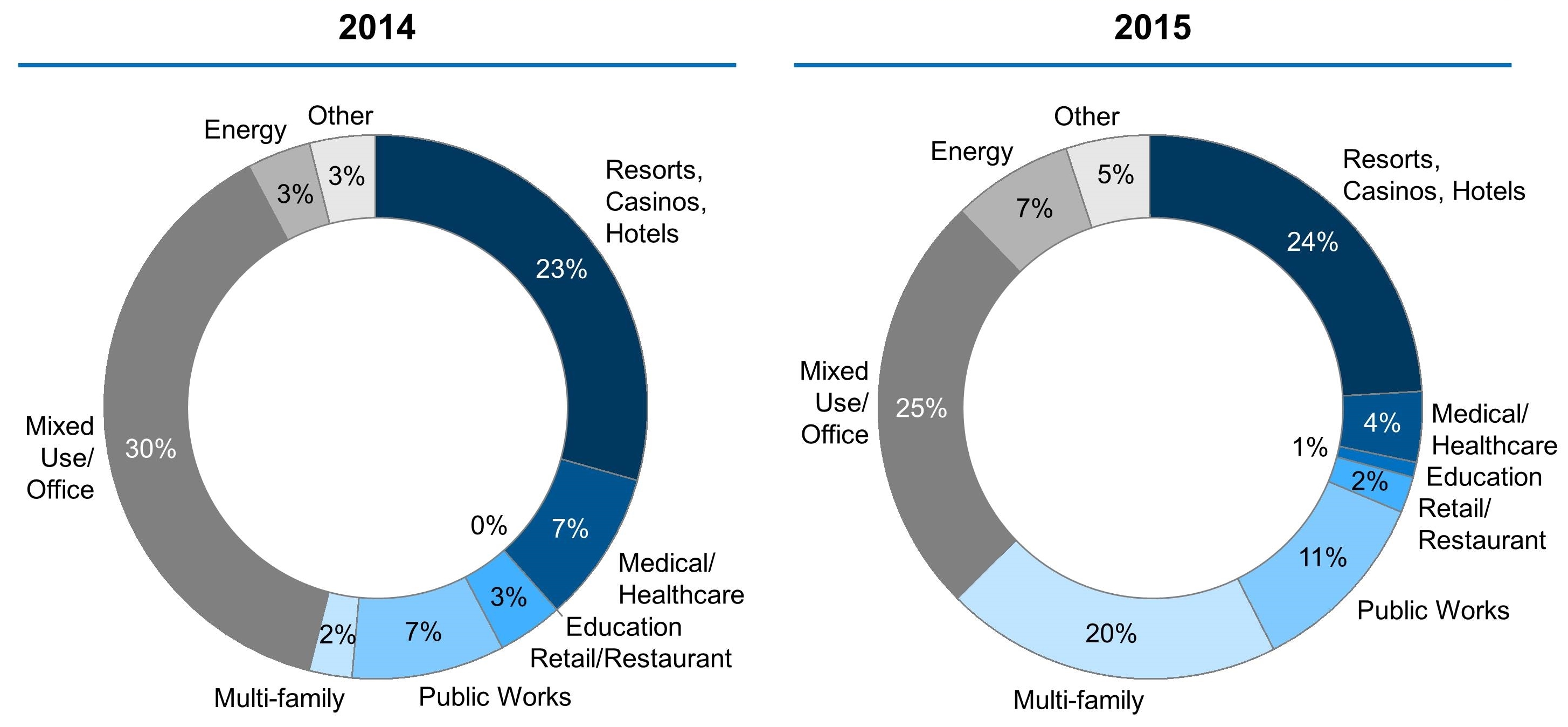 Developers and investors showed more interest in resort, casino, and hotel developments as well as multi-family housing projects in 2015 than they did in 2014. Meanwhile, projects in retail and restaurant developments, public works, and healthcare declined as a percentage of overall project distribution. Energy and mixed-use office space stayed relatively constant.