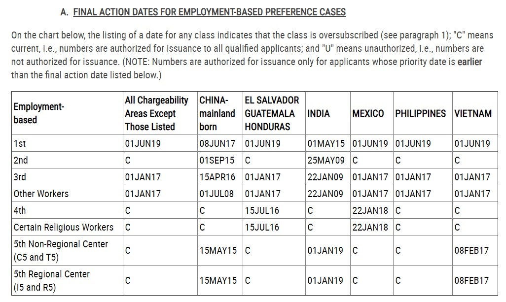 Most notable is the fast advancement of the final action date for Indian EB-5 investors. The new final action date for Indian EB-5 investors is January 1, 2019, an advancement of more than two months. This is a continuation of the rapidly advancing final action date for Indian EB-5 investors, with demand decreasing so much that the Indian backlog is expected to disappear by summer 2020.