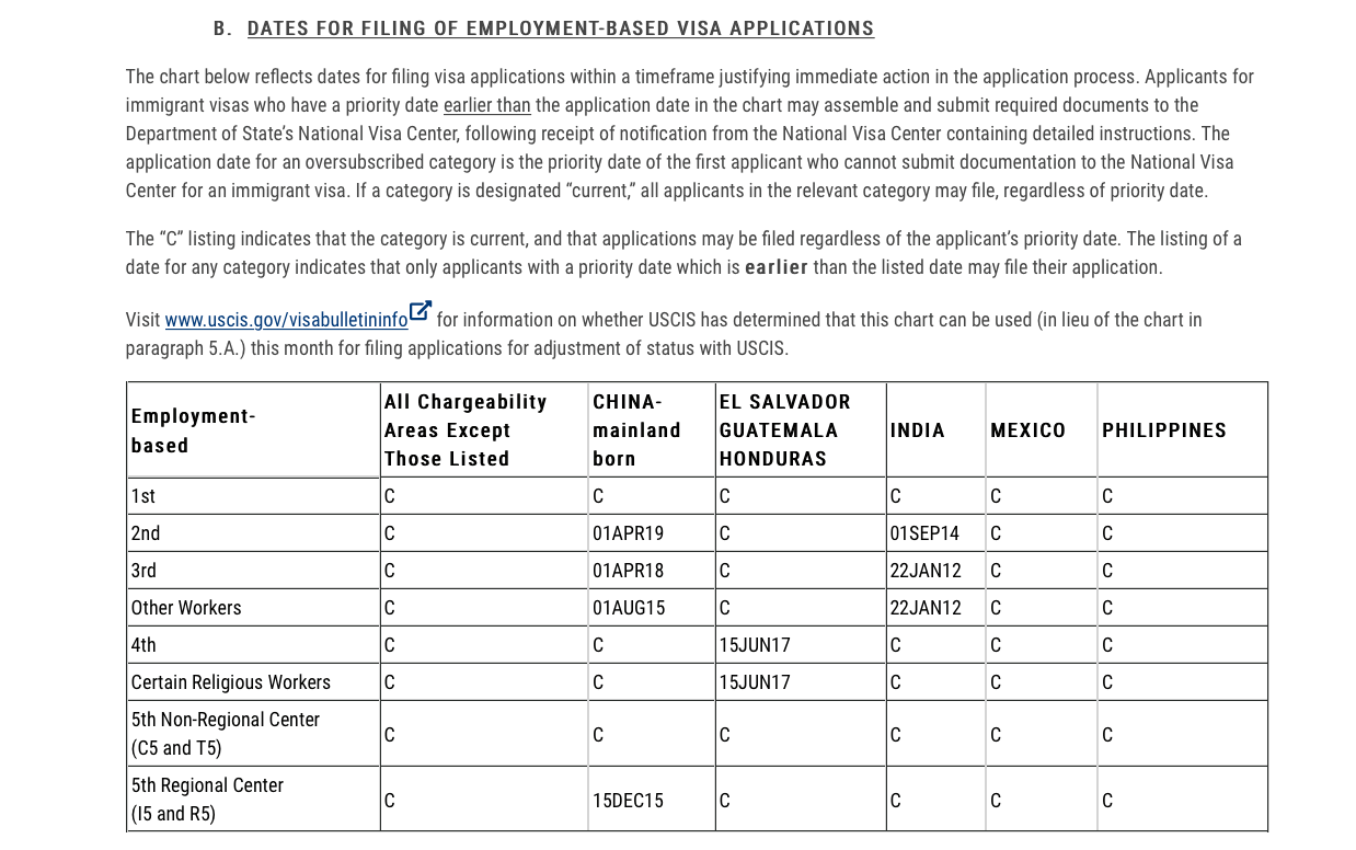 Chart B, Dates For Filing Of Employment-Based Visa Applications