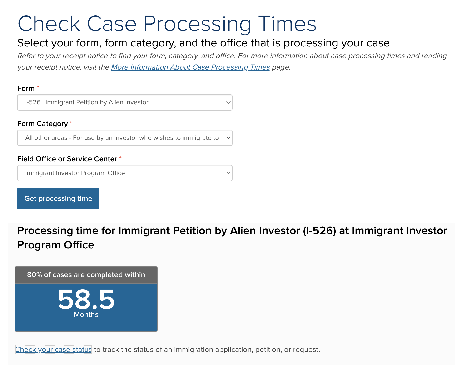 When an investor first searches for current I-526 processing times on the USCIS website, they will come across this number “58.5 months”, current as of January 2023.