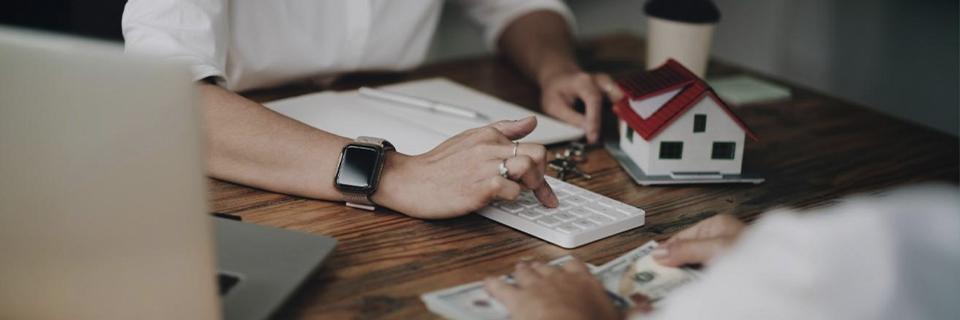 Close-up of a business desk with hands using a keyboard, financial documents, and a house model, symbolizing the financial aspects and benefits of Guaranteed Maximum Price (GMP) contracts for EB5 investors in real estate projects.